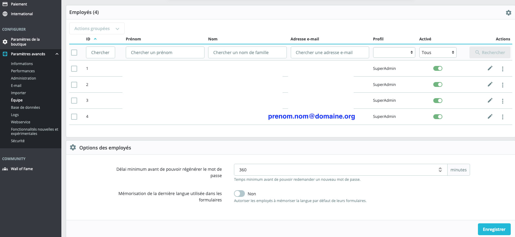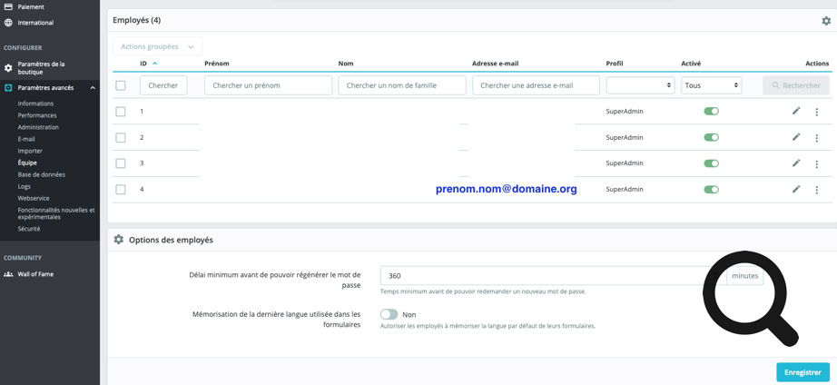 Le chemin est : paramètres avancés => équipe